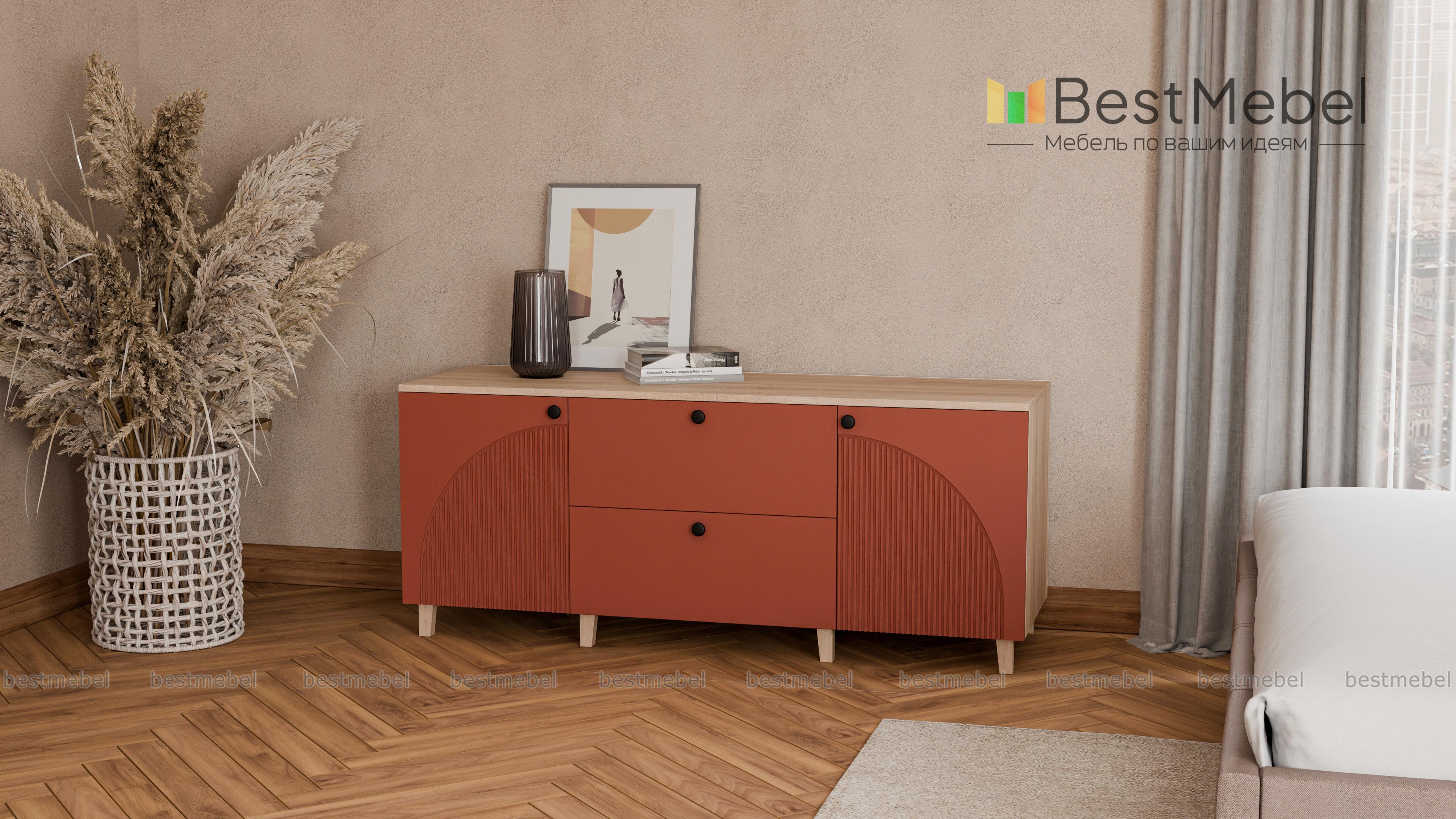 Комод Вивьен 4 BMS с высокими деревянными ножками поможет вам организовать хранение вещей и украсит интерьер. Широкий современный комод оборудован парой распашных секций с полками и двумя вместительными ящиками в центральной части. Прочный корпус изготовлен из ламинированной плиты, которая выдерживает большие нагрузки, а для фасада использован МДФ со стильным рельефом. Купить комод Вивьен 4 BMS приглашаем в наш интернет-магазин, по желанию изменив цвет и размеры.