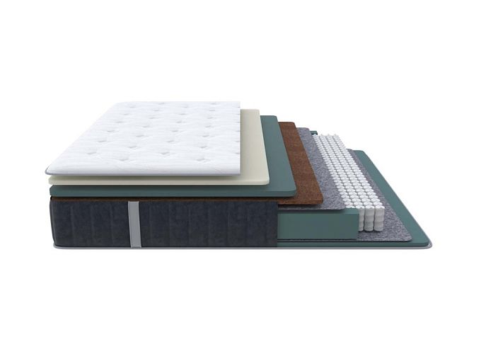 Состав: Меморикс 2см Ортофом (ППУ) с эффектом памяти) \ Ортофом (ППУ) повышенной жестоксти 3 см \ Кокос 2см \ Термовойлок \ EVS620 14см \ Термовойлок \ Ортофом (ППУ) повышенной жесткости 2см \ Короб усиленный (ВППУ).