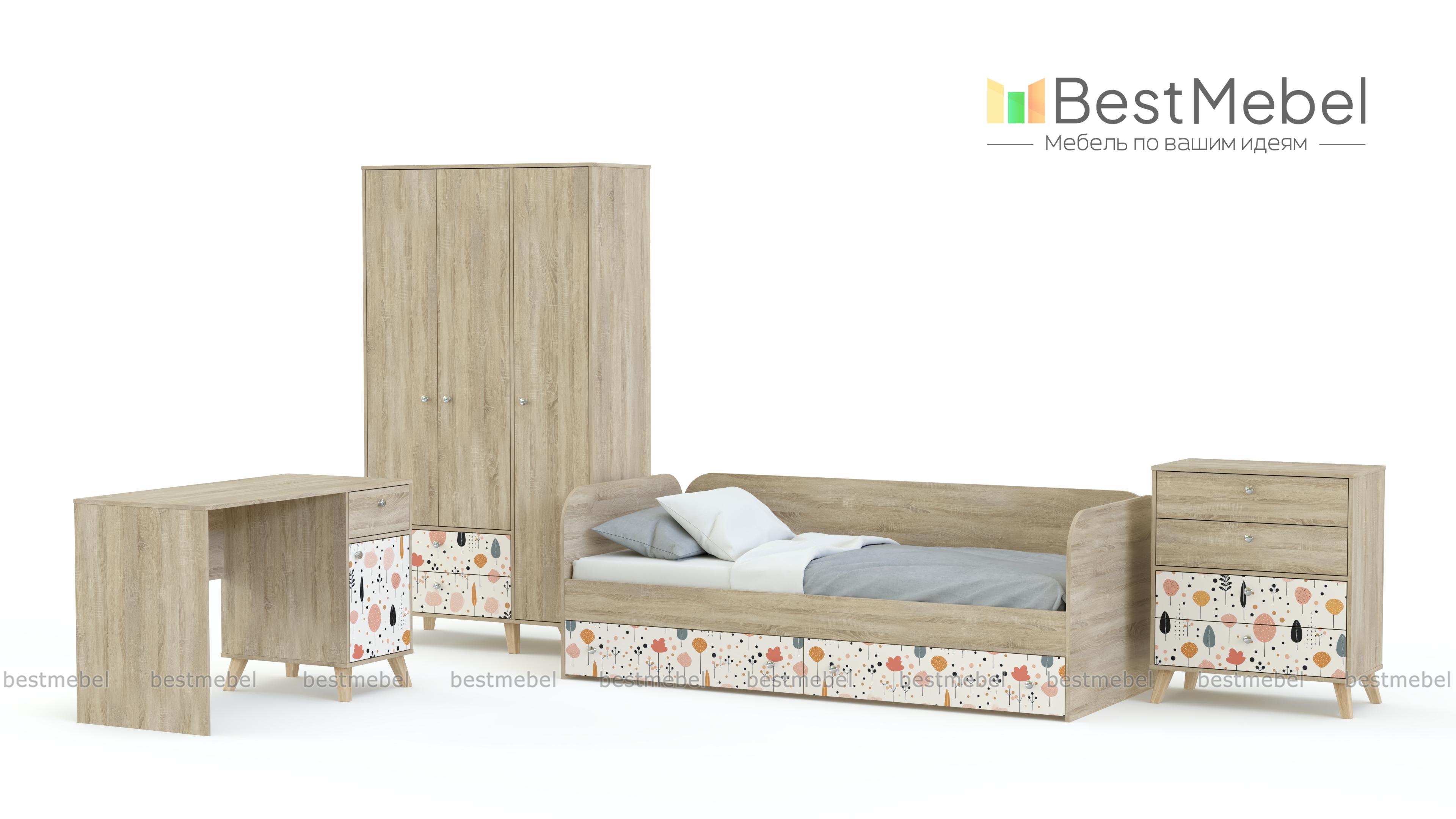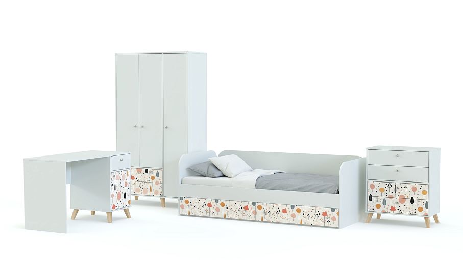 Детская комната Эльза 4 BMS создает пространство для отдыха, игр и учебы с удобной системой хранения. В комплекте уютная кровать-софа со скругленными спинками и письменный стол, а для размещения одежды, постельного белья и всевозможных мелочей предусмотрены трехдверный шкаф с ящиками и комод. Светлый оттенок мебели универсален, а индивидуальности интерьеру добавляет стильный пастельный принт. Купить детскую комнату Эльза 4 BMS с учетом необходимых размеров вы сможете на сайте нашего интернет-магазина.
