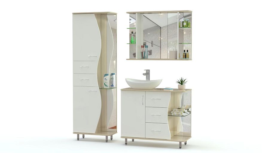 Комплект для ванной комнаты Стайн 3 BMS эффектно сочетает в оформлении нейтральный глянец, зеркала и хромированные элементы. Ультрасовременная композиция для просторного помещения включает в себя напольную тумбу под раковину, высокий пенал и навесное зеркало с боковыми полочками для мелочей. Распашные, выдвижные отделения и открытые секции сделают хранение максимально удобным, а волнообразно вырезанные фасады станут украшением интерьера. Купить комплект для ванной комнаты Стайн 3 BMS приглашаем к нам в интернет-магазин.