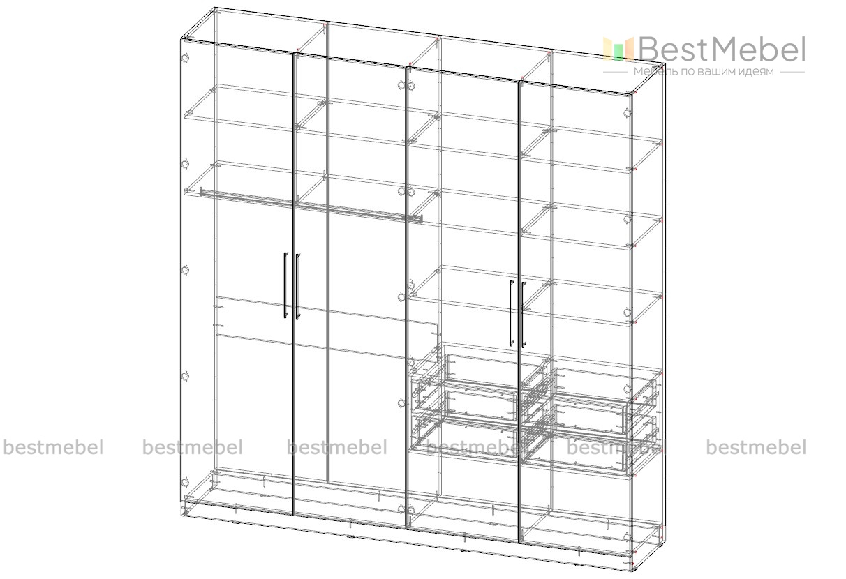 Шкаф распашной справа платье- со штангой овал, слева -белье с полками и снизу выдвижные ящики, петли с доводчиком, направляющие на ящиках с доводчиком.