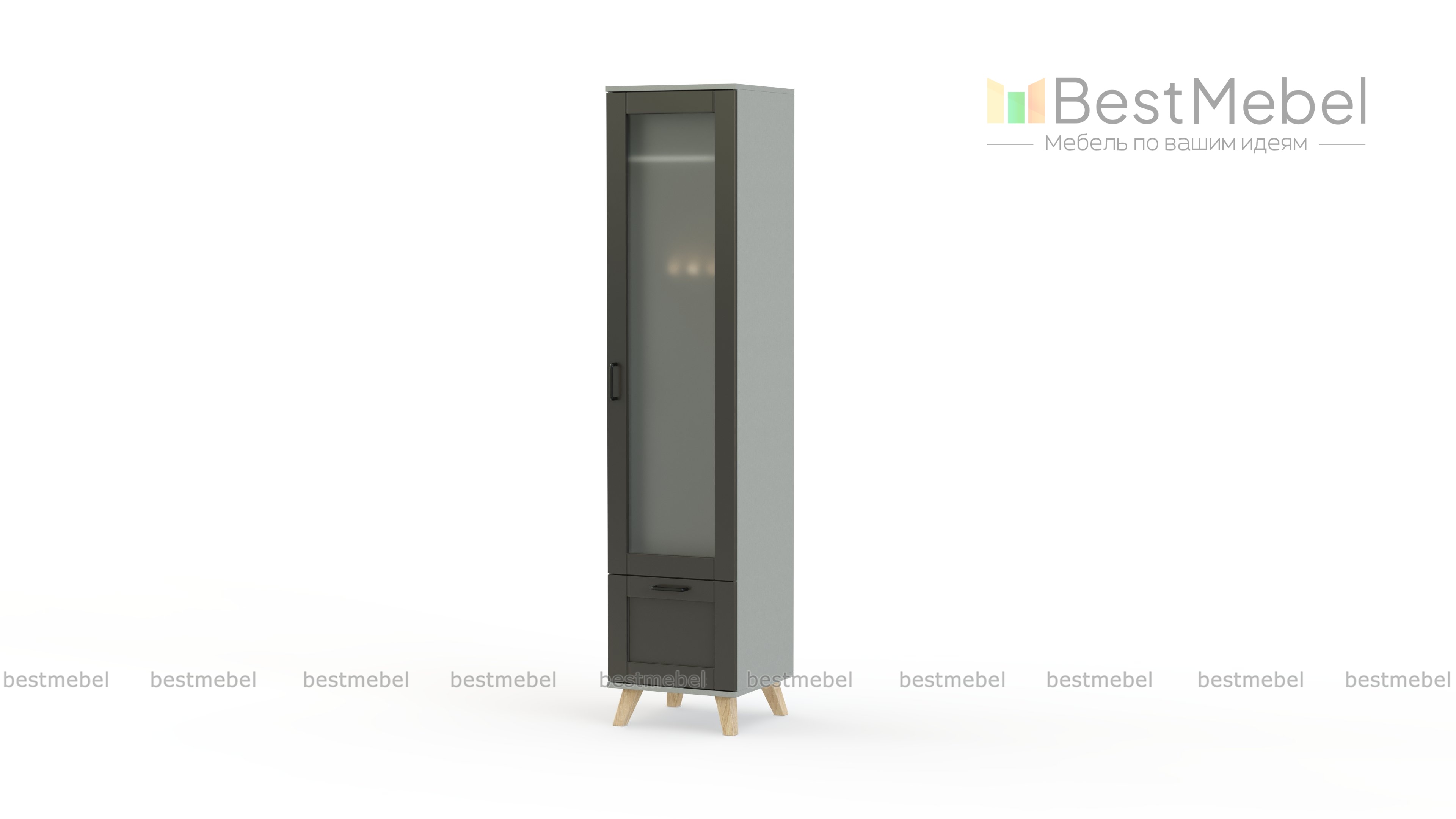 Шкаф-пенал Веста 20 BMS можно комбинировать с другими модулями коллекции или использовать самостоятельно в современном интерьере. Застекленное распашное отделение дополнено выдвижным ящиком с глухими фасадом, оформленным широким рамочным профилем. Темный оттенок фасада составляет стильный контраст со скошенными опорами в цвете венге. В шкафу 3 дополнительные полки. выдвижная штанга и деление в ящик выдвижной.