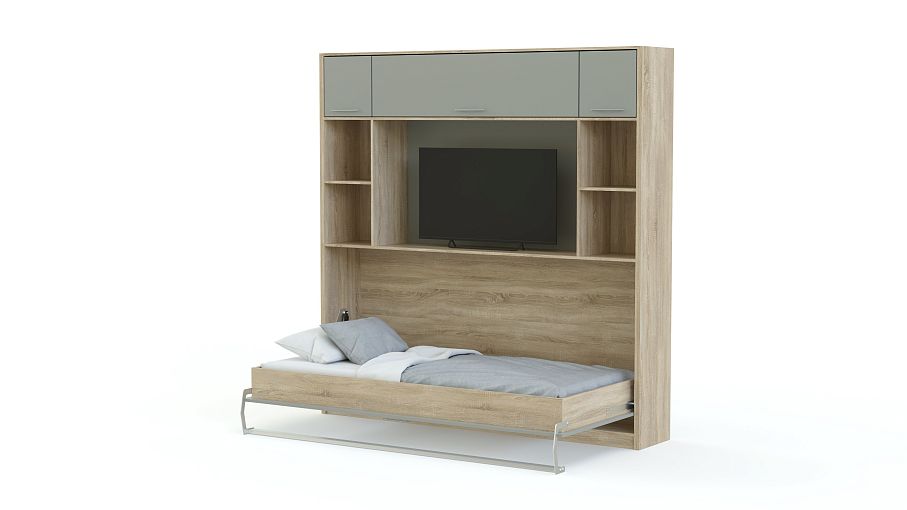 Шкаф-кровать трансформер Лайм BMS поможет освободить комнату от лишней мебели и сэкономить пространство. Многофункциональная модель оборудована антресольными секциями, открытыми книжными полками, просторной нишей под ТВ или предметы декора и модулем с откидной кроватью. Благодаря горизонтальному механизму подъема композиция не занимает много места и оптимальна для узких помещений, а минималистичный дизайн гармонично дополнит современные интерьеры. Купить шкаф-кровать трансформер Лайм BMS приглашаем в наш интернет-магазин.