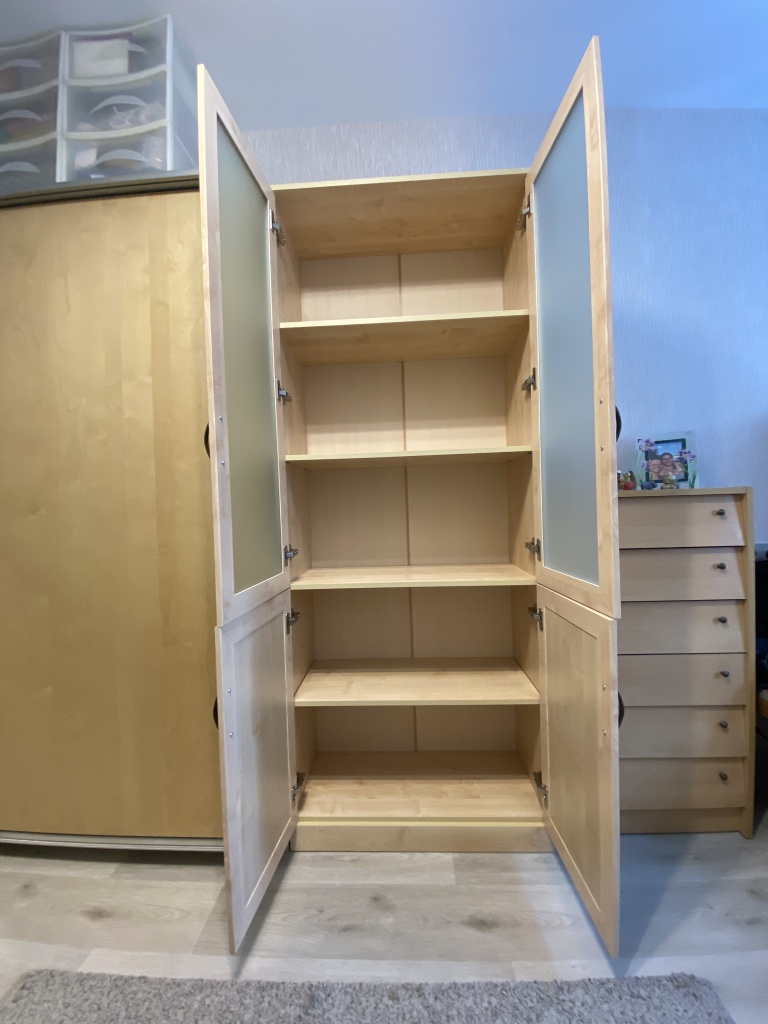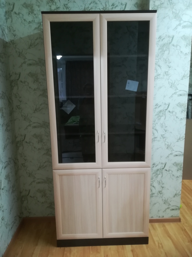 Хороший книжный шкаф. Сделали под мои размеры + выбрал дверцы с доводчиками и подрезку под плинтус, и еще ручки. Лучше собирать в конструкторе, чтобы не упустить детали изделия. Изготовление и доставка до Беларуси +/- 3 недели, собрать шкаф можно самому. Пару дней пах ДСП или краской, или еще чем-то таким, потом проветрился и сейчас все нормально. Заказ:№ 1229910.