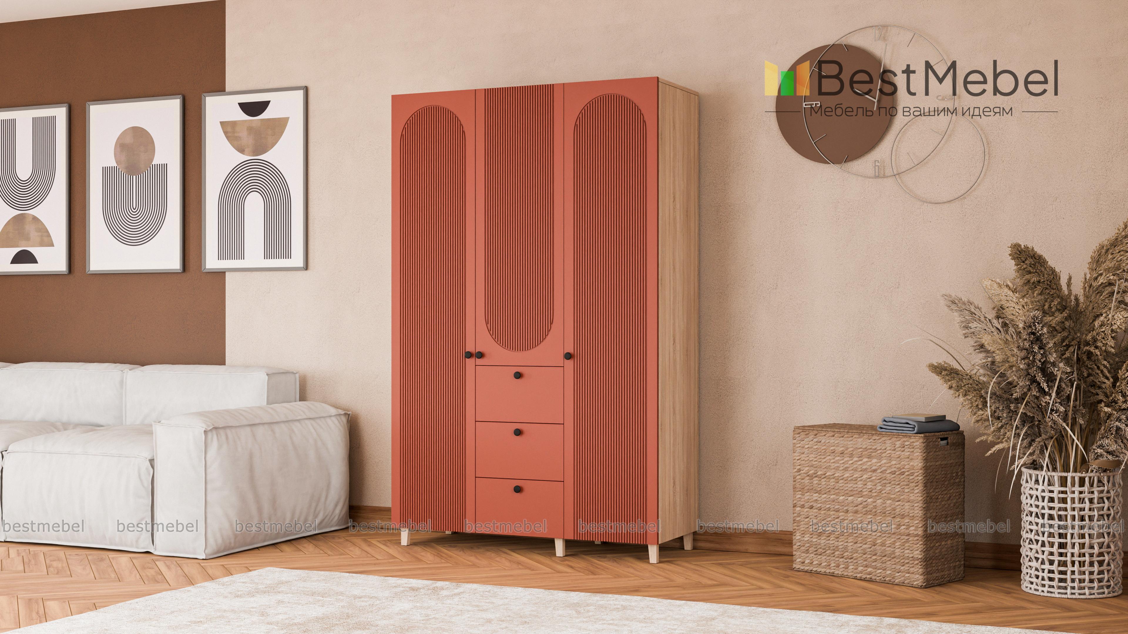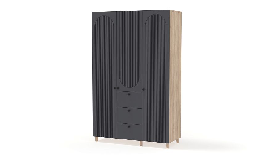 Шкаф распашной Рене 22 BMS с высокими ножками прекрасно подходит для меблировки спален, прихожих и гостиных. Помимо распашных отделений для белья и одежды трехдверный шкаф оборудован рядом из трех выдвижных ящиков, предназначенных для мелочей. На стильном темном фасаде из МДФ — оригинальный рельеф и миниатюрные круглые ручки. Купить шкаф распашной Рене 22 BMS в оттенках из нашего каталога и необходимом размере вы сможете недорого на сайте интернет-магазина.