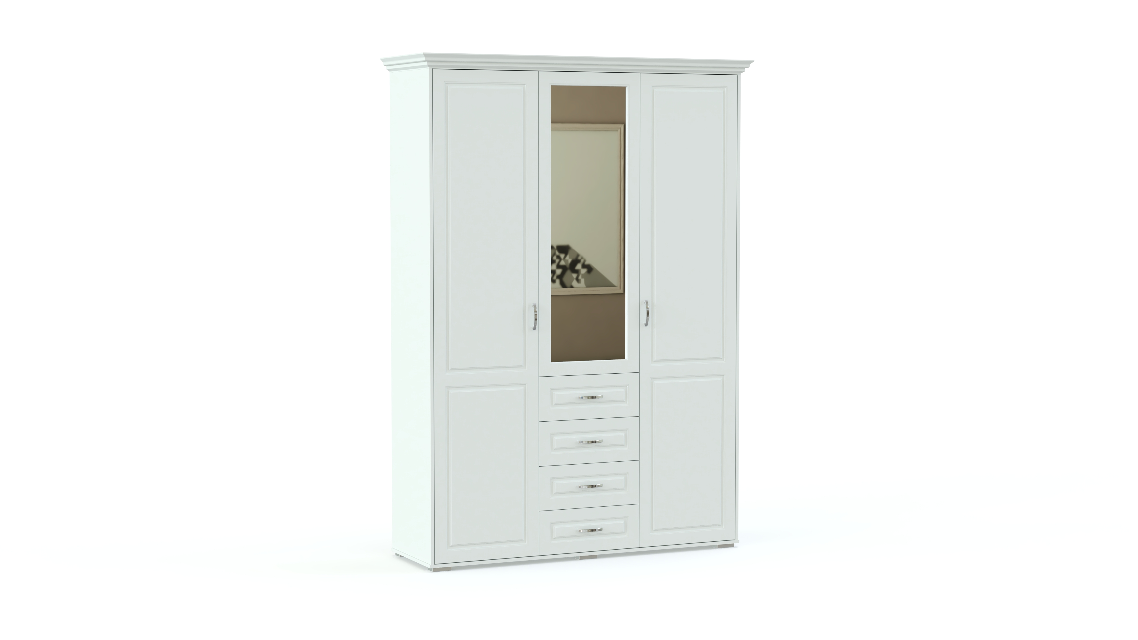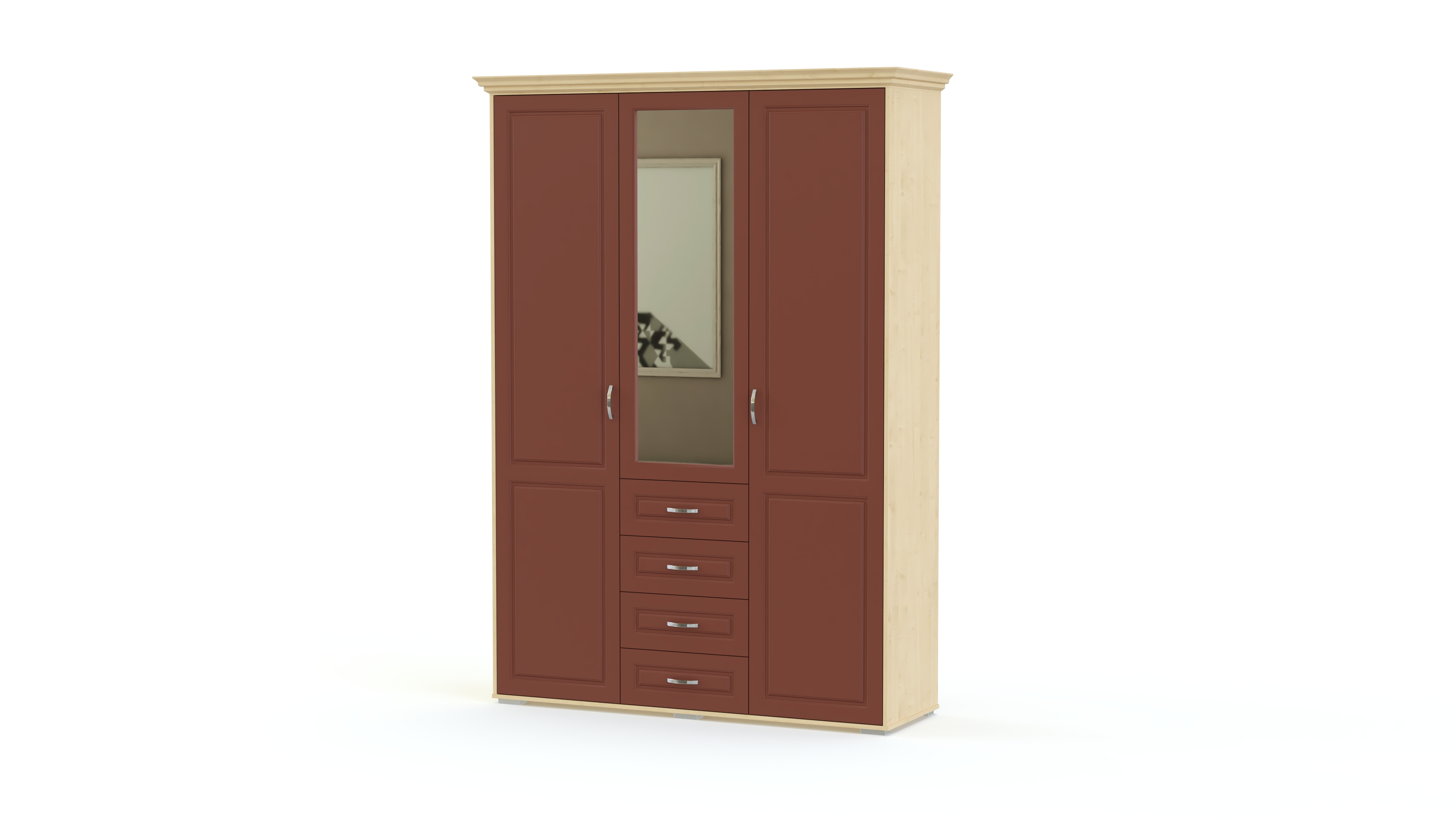 Спальня Мирма 4 BMS станет выбором тех, кто ценит сдержанную элегантность классики. Эффектный гарнитур состоит из кровати, высокая спинка в изголовье которой декорирована экокожей с каретной стяжкой, прикроватных тумб, бельевого комода с зеркалом, а также трехдверного распашного шкафа с выдвижными ящиками для мелочей. Фрезерованные фасады предметов выполняются в благородных древесных тонах. Купить спальню Мирма 4 BMS по лучшей цене вы сможете в нашем интернет-магазине.