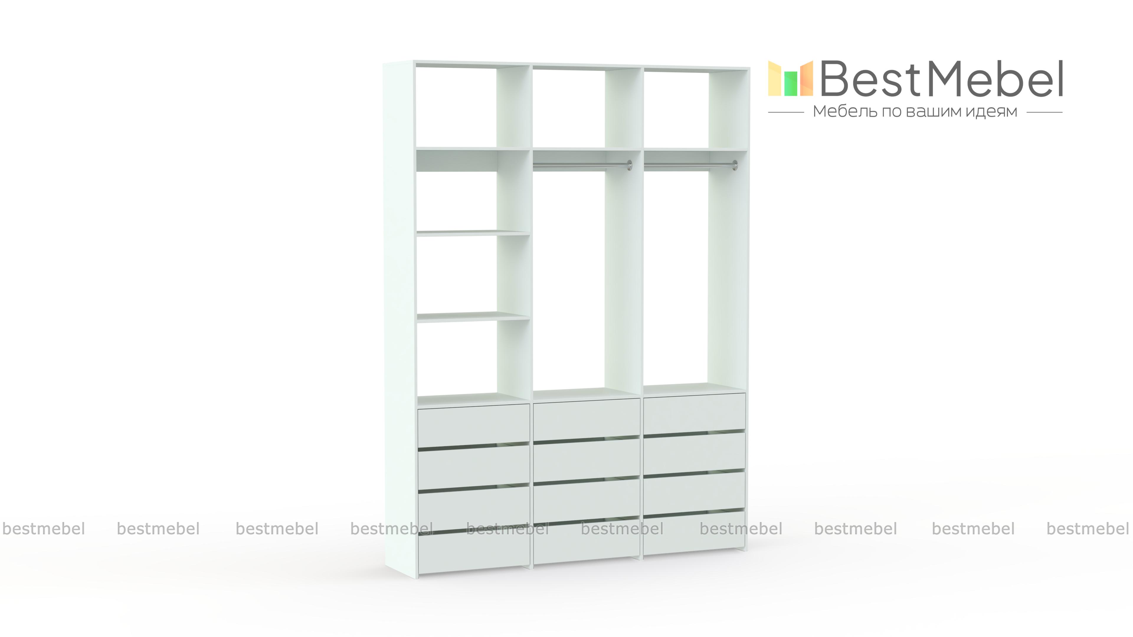 Стеллаж для одежды Мирта 48 BMS имеет минималистичный и функциональный дизайн. Трехсекционная конструкция включает в себя штанги для вешалок с одеждой, выдвижные ящики для белья и верхние полки, отделение слева для удобства также разделено двумя полками. Материал изготовления — прочная и долговечная ламинированная плита. Купить стеллаж для одежды Мирта 48 BMS, выполненный по индивидуальным размерам, вы сможете недорого на сайте нашего интернет-магазина.
