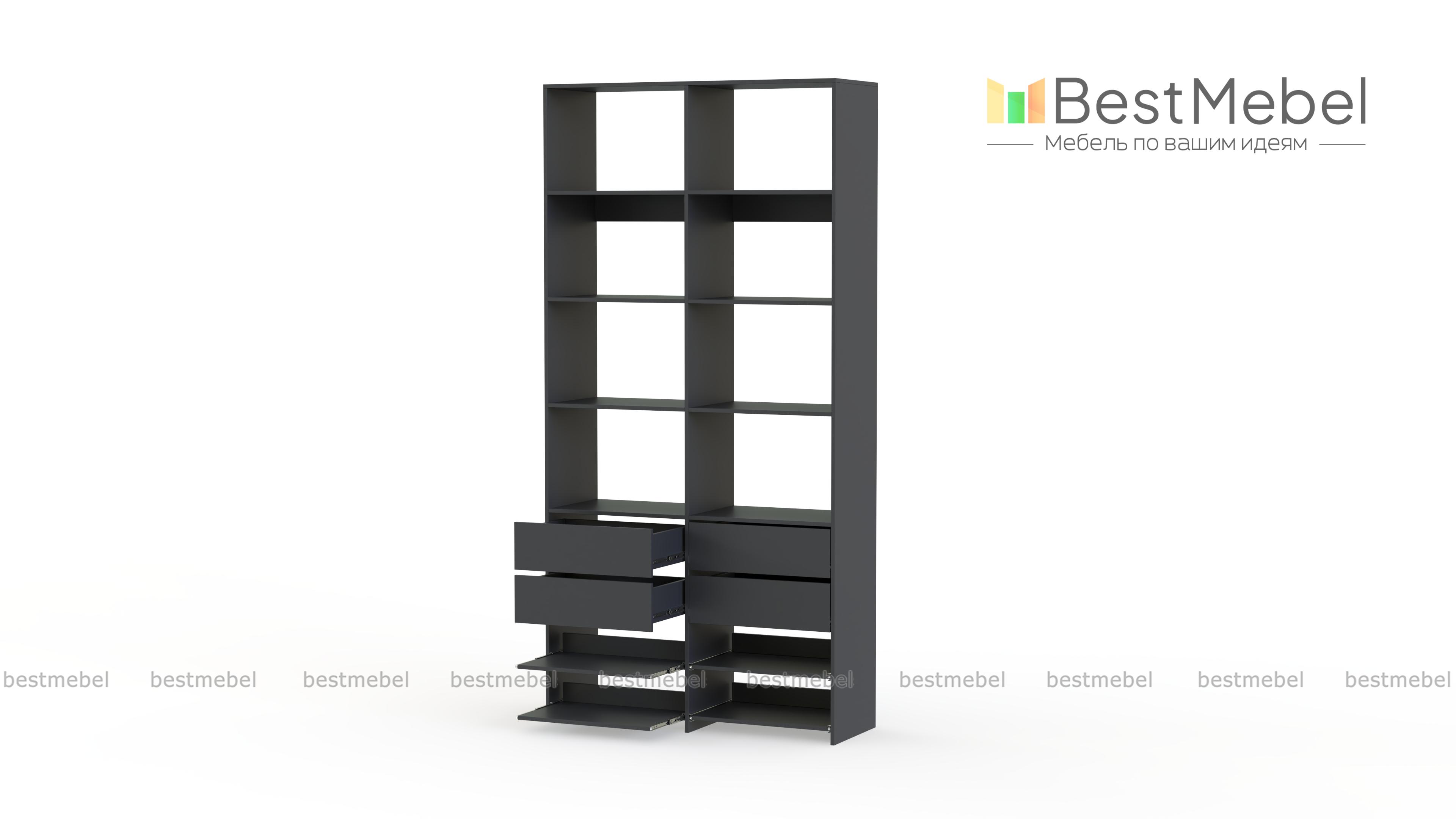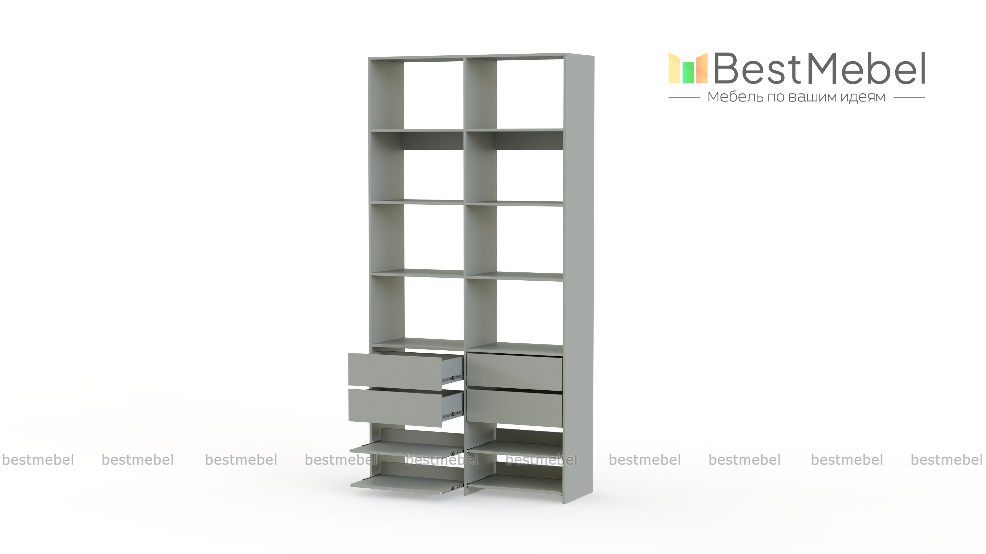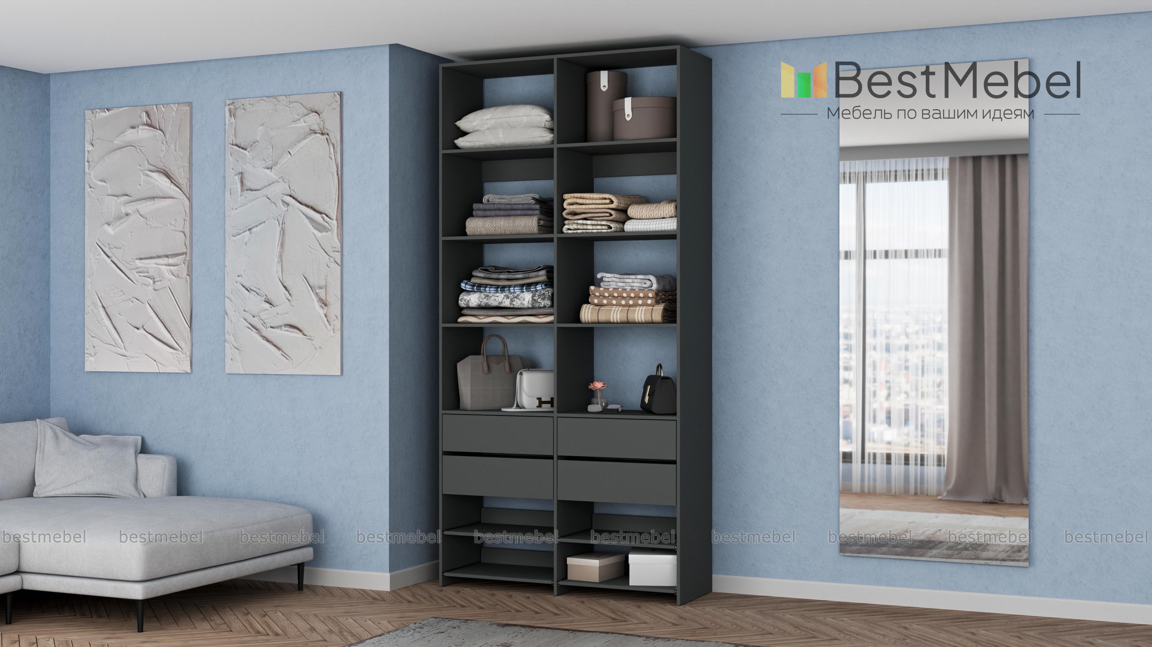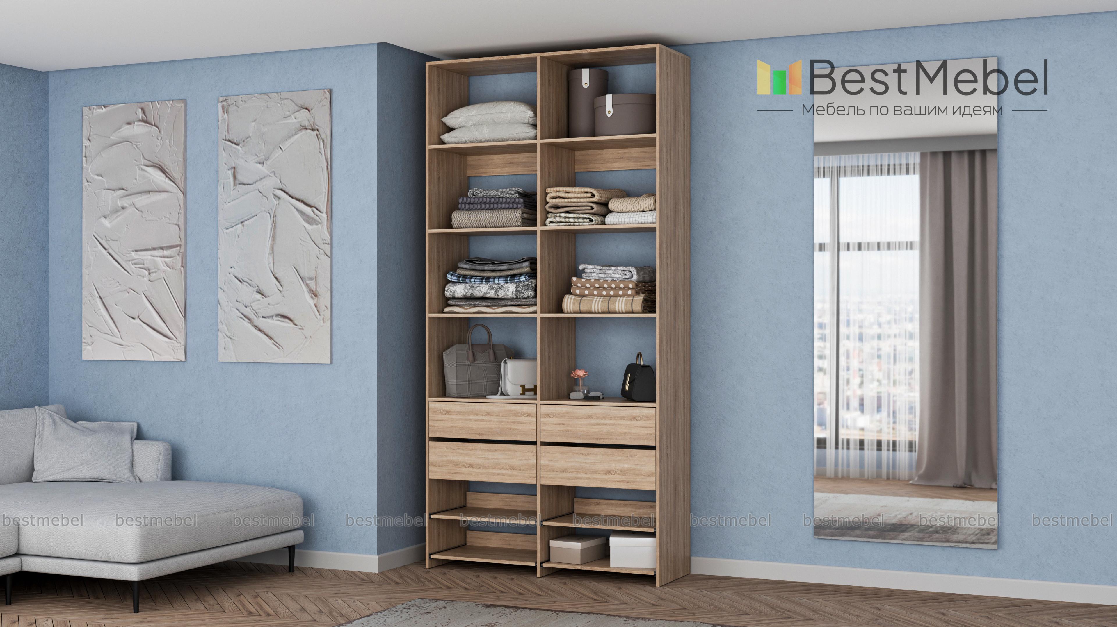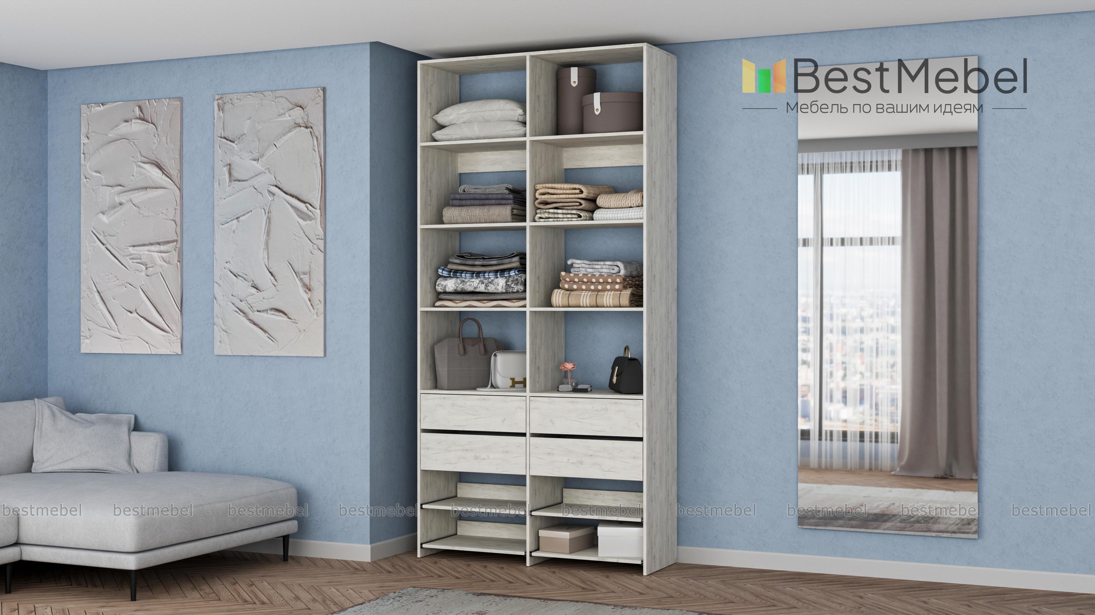 Стеллаж для одежды Мирта 85 BMS компактен и подходит для небольших помещений: прихожих, спален и гардеробных. Верхнюю часть конструкции занимают вместительные открытые секции, а нижнюю — четыре выдвижных ящика для белья и мелочей и удобные полки на направляющих. Продуманная компоновка позволит вам хранить как одежду и аксессуары, так и обувь. Купить стеллаж для одежды Мирта 85 BMS с самостоятельным подбором цвета и размеров вы сможете в нашем интернет-магазине.