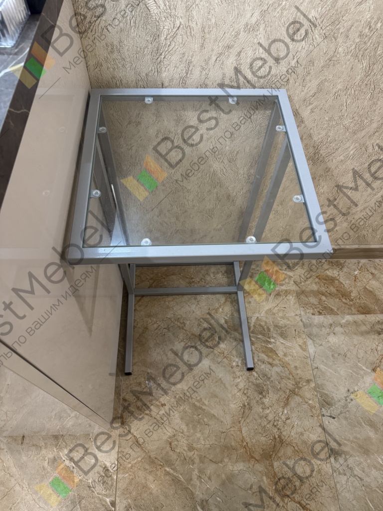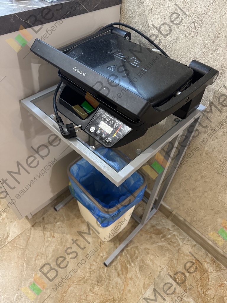 Столик отличный. Заказывали под электрический гриль размером 40*70*40. Выполнен качественно и с бонусами вышло достаточно дешево. Стекло каленое, не должно разбиться в случае чего. Под столик поставили мусорное ведро для экономии места. Заказ номер 00000263486