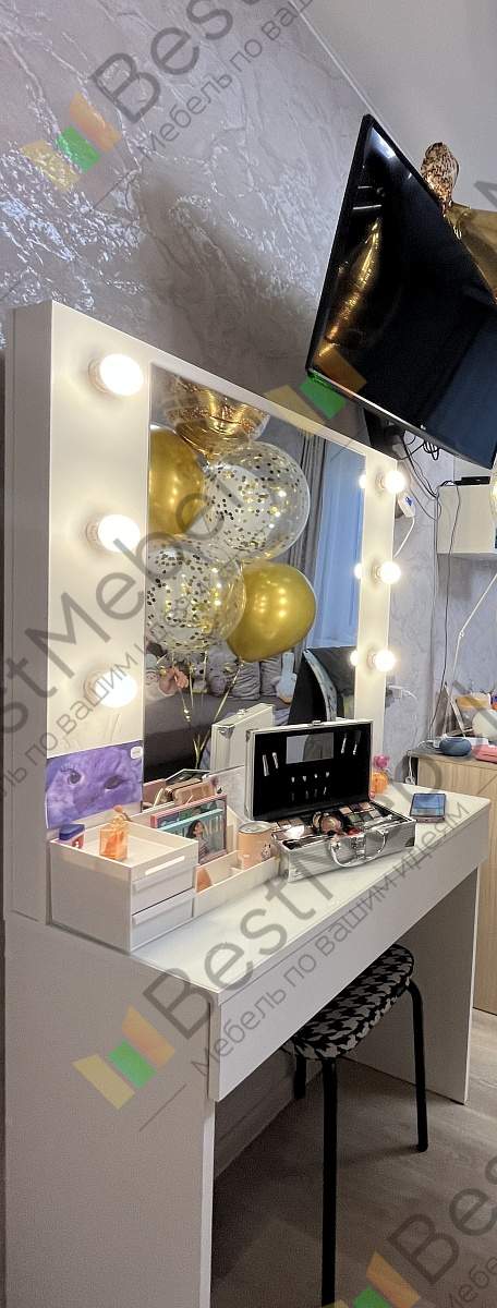 Восхитительный туалетный столик! Изначально шёл с одним ящиком, но оператор, согласовывая заказ по телефону, предложила сделать два, чтобы распределить нагрузку на базовую фурнитуру (бесплатно). Решение оказалось правильным, в одном ящике теперь хранится косметика, в другом украшения, очень удобно! Нравится стеклянная поверхность столика. Выбором довольна!