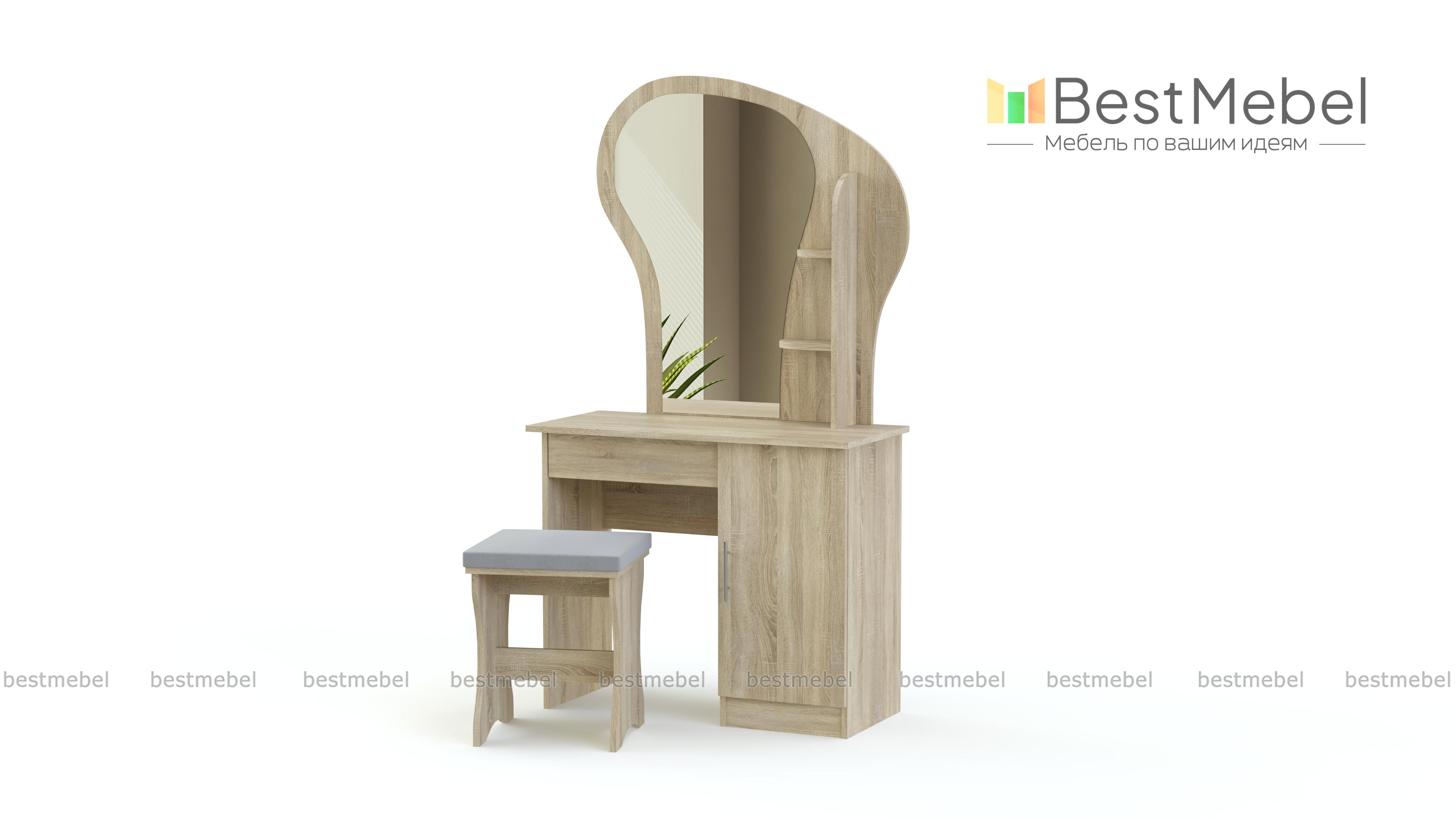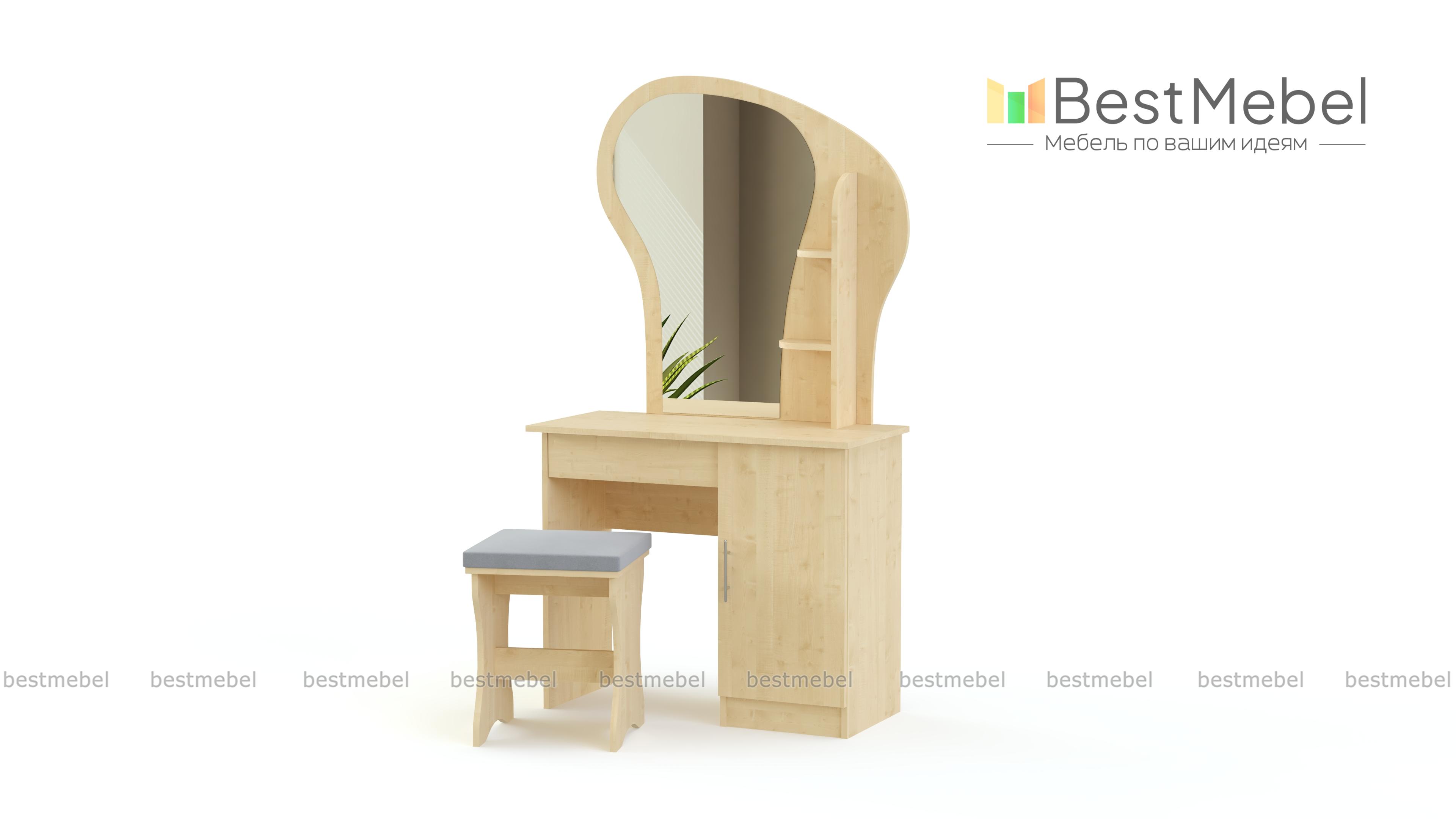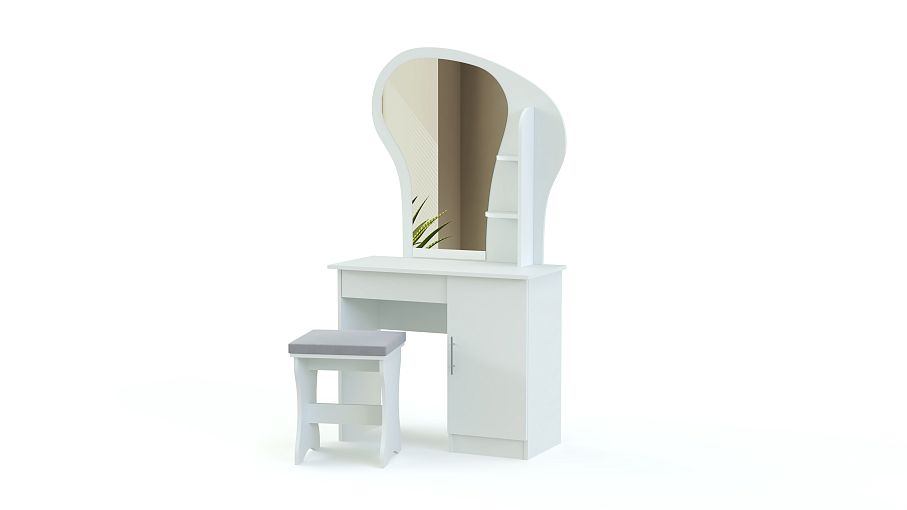 Туалетный столик Светлана 34 BMS гармонично дополнит другие предметы спального гарнитура. Для удобного хранения средств по уходу и аксессуаров стол оборудован распашной тумбой и открытыми боковыми полочками, а необычный вид модели придает обтекаемой формы зеркало на фигурной панели. С комфортом расположиться за столиком позволит выполненная в едином стиле банкетка с мягким сиденьем. Купить туалетный столик Светлана 34 BMS приглашаем недорого в наш интернет-магазин.