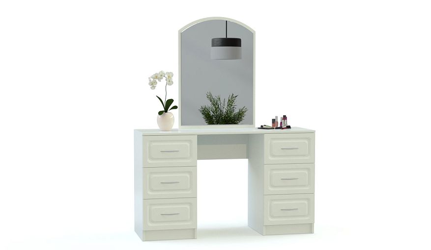 Туалетный столик Ульяна BMS порадует вас своим необычным дизайнерским решением и внушительной функциональностью. Фрезерованные фасады выгодно выделяются на эффектной текстуре древесного оттенка, а высокое зеркало с элегантным изгибом придаст вашей спальне или гостиной ощущение уюта. Шесть вместительных выдвижных ящиков позволят решить проблему экономии пространства, ведь вы сможете разместить в них все необходимые мелочи. Купить туалетный столик Ульяна BMS вы сможете в нашем интернет-магазине по приятной цене.