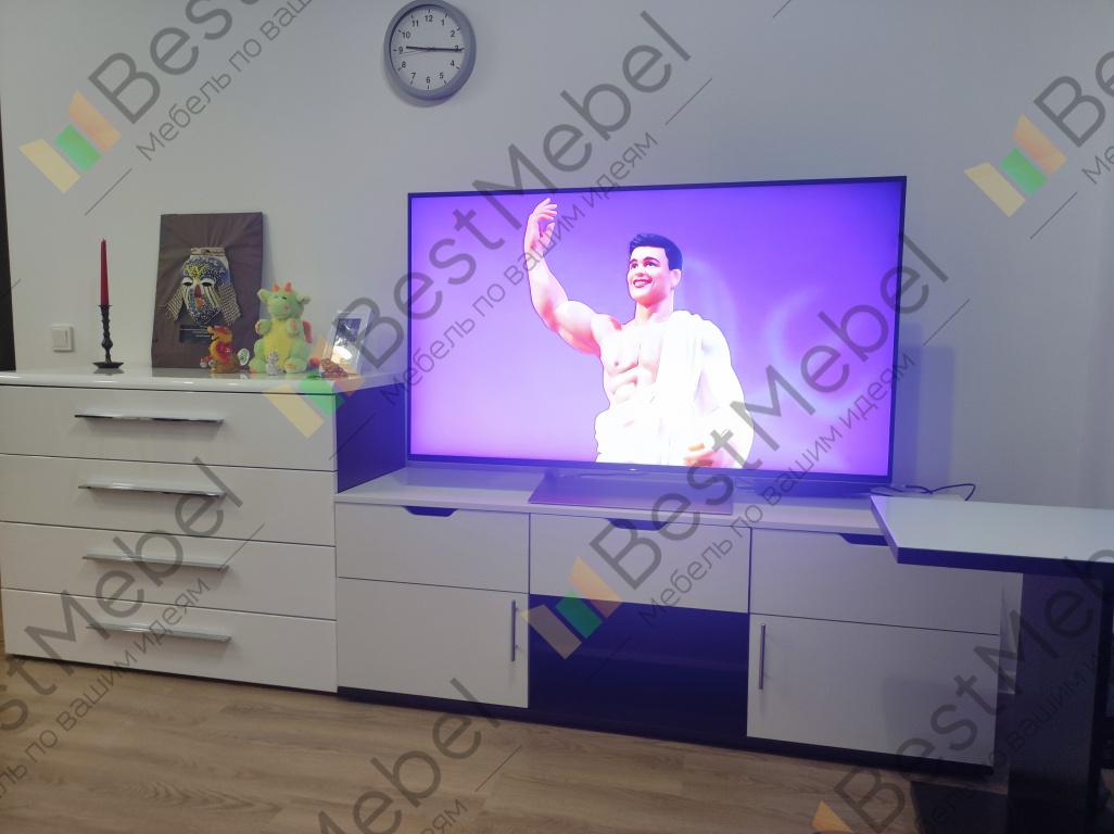 Тумбу под телевизор использую в качестве тумбы под игрушки, книги и игры ребёнка. Просто супер-решение! Выбрала цвет материалов под уже имеющуюся мебель в комнате. На поверхности тумбы ребёнок играет. Все отлично: от дизайна, до исполнения и доставки. Спасибо!