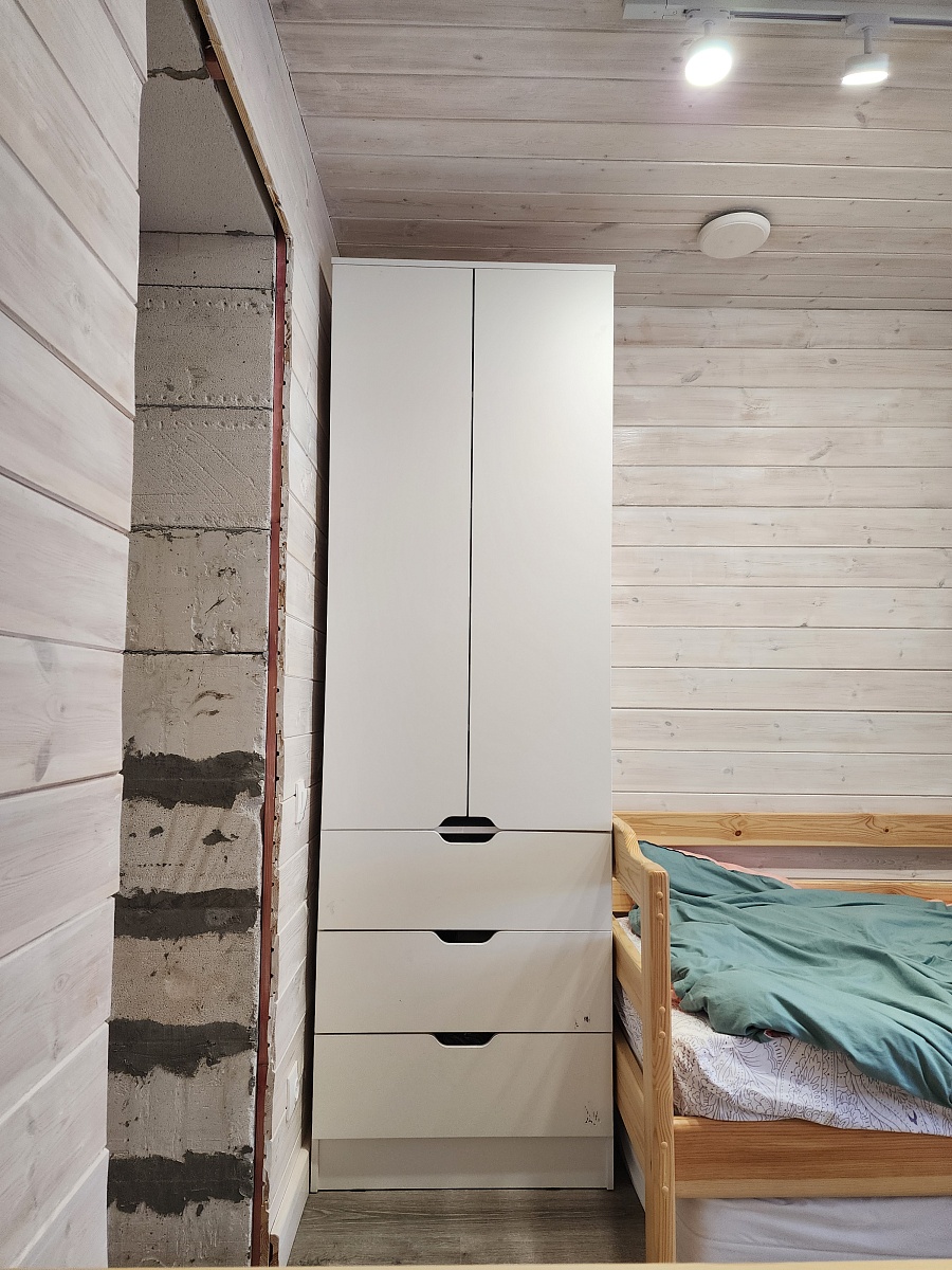 Заказ 00000250759. Заказали шкаф шириной 70 см, с полками вместо штанги. Вместо русек заказали вырез. Всё получилось идеально. Собирали сами.