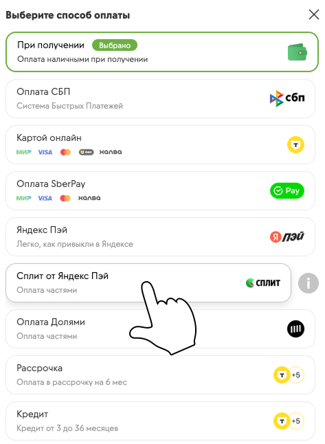 Обычный СплитЧтобы оплатить заказ по частям, необходимо при оформлении заказа указать способ оплаты "Яндекс Сплит". Далее на странице подтверждения выберите пункт "Оплатить".